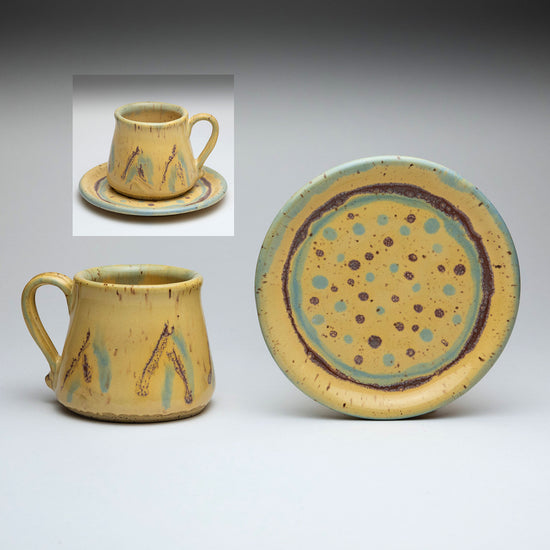 Espresso cup and plate set in soft yellow with pastel turquoise and pale purple accents is a balance of style and design. Just the right size for a long shot of your favourite espresso with enough space for a spot of milk or foam on top, accompanied by a morning toast or pastry. Or enjoy an afternoon Turkish coffee with a decadent dessert. This set would also suit a small child's hot chocolate and muffin. The small plate is perfect for a small serving of cheese/nuts. Mary Anne's bio.