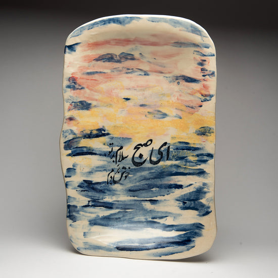 Large platter with Persian writing. Translation: "Hail to the glory of morning". Nice size for a serving dish. Shamsi's bio.